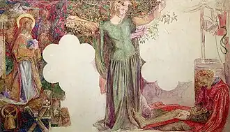 The murals were commissioned by John Ruskin and the subject was probably chosen as a result of earlier Pre-Raphaelite interest in Arthurian themes, such as the illustrations to Edward Moxon's 1857 edition of Tennyson.[1] In addition to Rossetti, Morris and Burne-Jones, several other artists agreed to contribute. These were the painters Val Prinsep, Arthur Hughes, J. H. Pollen, John Roddam Spencer Stanhope and the sculptor Alexander Munro.[2]