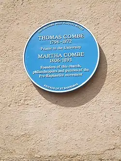 The plaque commemorating Thomas and Martha Combe in Jericho, Oxford.