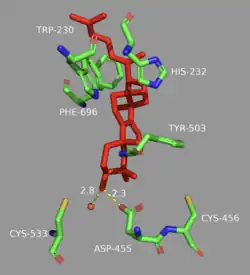 - ^ a b c d e Tian BX, Eriksson LA (November 2012). "Catalytic mechanism and product specificity of oxidosqualene-lanosterol cyclase: a QM/MM study". The Journal of Physical Chemistry B. 116 (47): 13857–13862. doi:10.1021/jp3091396. PMID 23130825.