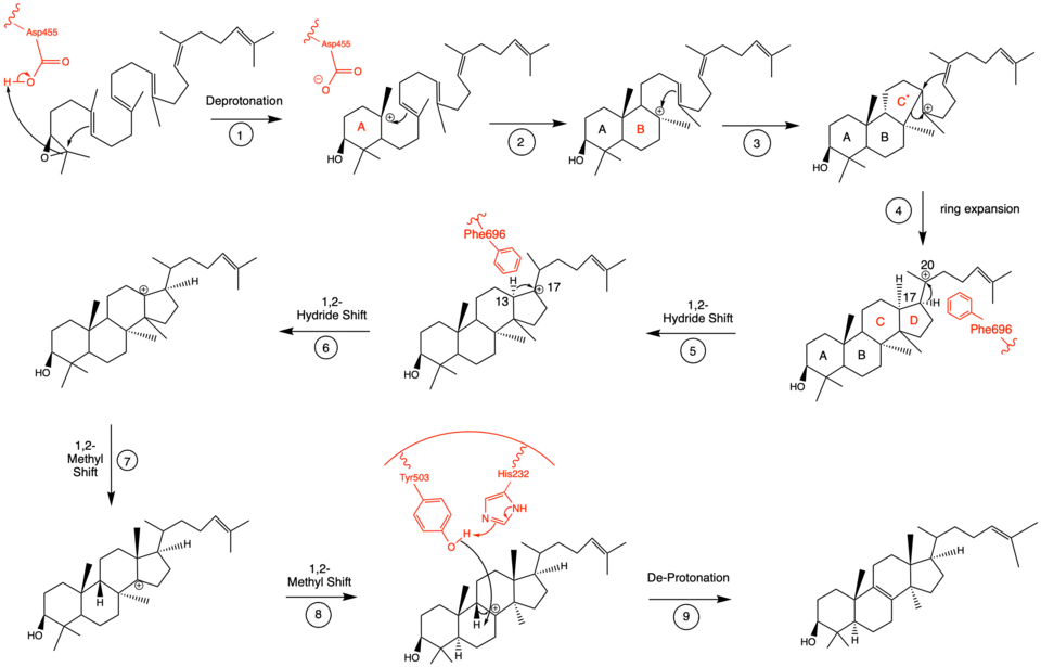The intermediate formed after the four ring closures undergoes two 1,2-hydride shifts and two 1,2-methyl shifts to be in position for final de-protonation.[16] Molecular dynamics simulations have proved critical to understanding the conformational changes that oxidosqualene-lanosterol intermediates undergo.[16] Researchers have identified Phe696 as a critical amino acid for controlled and specific hydride shifting in this mechanism (steps 5-6), as it speeds up the shift by lowering the energy barrier of the respective transition states.[16]