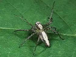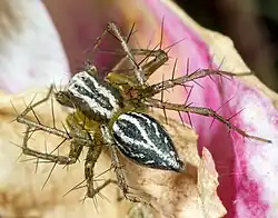 Oxyopes is a genus of lynx spiders found worldwide. It includes arounds 300 species and is classified under the lynx spider family Oxyopidae.[1][2] Like other lynx spiders, they are easily recognizable by the six larger eyes arranged hexagonally on top of the head (prosoma), with the remaining smaller two eyes in front. They are also characterized by long spine-like bristles (setae) on their legs.[3] They are ambush predators, actively hunting prey by sight. Though they produce and use silk, they do not build webs to capture prey.[4]