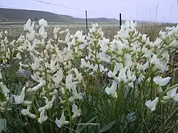 This plant, a species of locoweed, is a common cause of poisoning in livestock in North America. Locoweed poisoning is "the most widespread poisonous plant problem in the western United States."[3] Locoweeds cause locoism, a disease state resulting from chronic neurological damage. Symptoms of locoism include depression, blindness, loss of coordination, emaciation, tremors, paralysis, constipation, deterioration of the coat, decreased libido, abortion, seizures,[4] and death. It may also predispose cattle to high mountain brisket disease, a type of congestive heart failure.[5] The toxic agent in the plant is swainsonine, an alkaloid. Animals affected include cattle, sheep, horses, goats,[6] and wildlife such as elk and mule deer.[6] Horses are very susceptible to the poisoning, and do not recover from locoism. Cattle, sheep, and horses[7] find the plant palatable and even preferable to other forages, even when grass is readily available. They may become chemically addicted to the plant.[3] Cattle tend to prefer the flowers and fruits of the plants, which contain higher levels of swainsonine than the leaves.[5] One to three months of heavy exposure can cause death.[3]