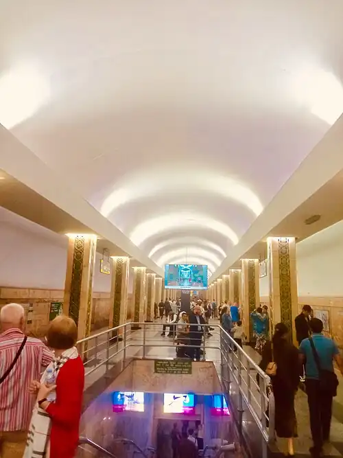 Oybek or Aybek is a station of the Tashkent Metro on Oʻzbekiston Line. The station opened on 8 December 1984 as part of the inaugural section of the line, between Alisher Navoiy and Toshkent.[1] It is named in honor of the poet Musa Tashmukhamedov.