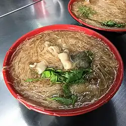 Oyster vermicelli or oyster misua (traditional Chinese: 蚵仔麵線; Taiwanese Hokkien: ô-á mī-sòaⁿ) is a kind of noodle soup originating in Taiwan.[1] Its main ingredients are oysters and misua (Chinese vermicelli). One of the famous places serving this is in Dihua Street, Dadaocheng, Taipei. A tan-brown variety of vermicelli used for this dish is made primarily with wheat flour and salt, and gains its unique colour due to a steaming process that darkens the sugars in the dough, allowing it to be cooked for longer periods without breaking down.[2]