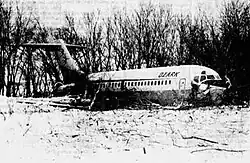 Ozark Air Lines Flight 982 was a regularly scheduled flight on December 27, 1968, originating from Sioux Falls Regional Airport to O'Hare International Airport connecting through Sioux Gateway Airport that crashed shortly after takeoff.[1] The plane struck the ground about 500 feet beyond the end of the runway and came to a stop about 1200 ft from the end of the runway.[2] Thirty-five of the flight's 64 passengers and four crew members were taken to area hospitals, mostly for treatment of minor cuts and scratches.[3][4]