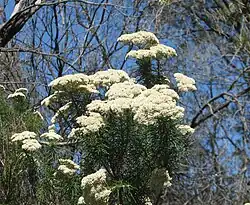 Flowering occurs in the summer months. O. ferrugineus inflorescence amusingly resembles cauliflower heads, composed of 80–300 densely-packed small white daisies.[3] These florets are in 5–6 compact hemispherical corymbose terminal clusters. Each flowerhead is cylindrical to bell-shaped, 3-5mm long with a 1-4mm diameter, and remain on the bush for long periods.[1][3] Appressed to the base of the flowerheads are 14–18 small bracts. The lower half of the inner bracts are translucent, whilst the upper half is an opaque white. The outer bracts are golden brown to green in colour.[3]