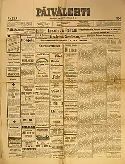 Päivälehti was a newspaper in Finland, which was then a Grand Duchy under the Czar of Russia. The paper was founded in 1889[1] as the organ of the Young Finnish Party and was published six days a week. The founding company of the paper was Sanoma which also started its activities the same year.[1] The founder of the paper was the Finnish journalist and later politician Eero Erkko who also served as its editor-in-chief.[1]