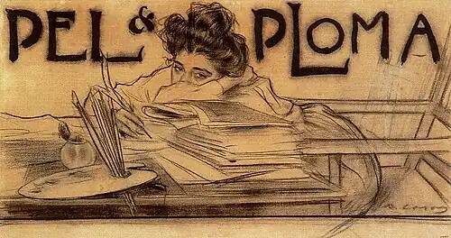 The magazine's covers were of great importance to not only its own success but also significantly to the success of Casas. The artist designed each cover, which he always created in color as to attract the eye of the public and gain readership.[9] This platform brought him a great deal of recognition for his artwork. He used a mixture of mediums, such as pencil, charcoal, and ink, to create these covers.[10] Some of the original drawings are on display in the National Art Museum of Catalonia. Perhaps the most recognizable of these images is the cover from issue 11, published 12 August 1899. The drawing features a woman slouched on a desk behind a stack of papers, a feather quill in hand and the magazine's title etched above her.[11]