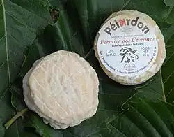 Pélardon (French pronunciation: [pelaʁdɔ̃] ⓘ), formerly called paraldon, pélardou and also péraudou, is a French cheese from the Cévennes range of the Languedoc-Roussillon region.[1] It is a traditional cheese made from goat's milk.[1] It is round soft-ripened cheese covered in a white mold (à pâte molle à croûte fleurie) weighing approximately 60 grams, with a diameter of 60–70 mm and a height of 22–27 mm.[1] Pélardon has benefited from Appellation d'origine contrôlée (AOC) status since August 2000.