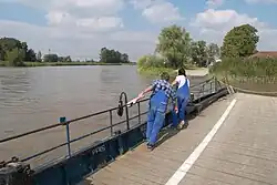The hand-operated, rope-guided punt-type ferry can transport up to three cars and about 30 foot passengers.[3] Its operating season is from May to early October and Wednesday to Sunday.[2] Today, the pünte is relatively strongly aimed at the tourist trade. The pünte season traditionally begins on 1 May and is celebrated a bit like a folk festival.