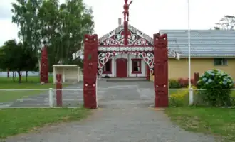 ![]() Looking through the waharoa (gate) and on to the meeting house Hikurangi in 2005 | |