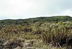 Pēpēʻōpae is located near the summit of Kamakou peak in eastern Molokaʻi at an elevation of about 4,800 feet (1,500 m) at 21°7′8″N 156°53′45″W / 21.11889°N 156.89583°W.[1] Poorly draining acidic soil leached of nutrients, rainfall that exceeds 300 inches (760 cm), cooler temperatures and high winds have resulted in a bog where the canopy has been reduced to plants that are only inches above the ground. Typical forest canopy trees such as ʻōhiʻa lehua (Metrosideros polymorpha) and ʻōlapa (Cheirodendron trigynum) can be found as groundcover, crawling along the surface.