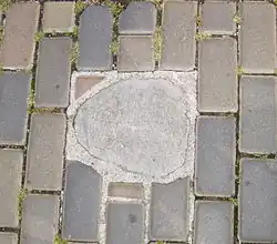 An c. 30 cm large rounded boulder with an engraved cross lies in the southeastern part of the square within the regular ceramic pavement. According to legend, an executioner's log used to stand on this spot. In 1470 or 1478, ten young men suspected of murdering a reeve were reportedly executed here.[6]