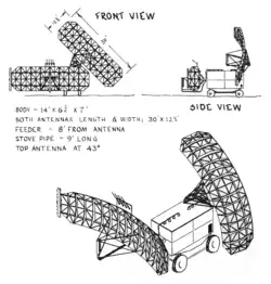 The P-30 is a semi-mobile radar consisting of a trailer mounting the control cabin and transmitter equipment, two Zil trucks carrying the power supply equipment and antenna trailers.[3] The antenna system of the P-30 is composed of two open frame truncated parabolic antenna accomplishing both transmission and reception. Both antenna are fed by a stacked beam composed of six feed horns.[4] The radar uses two antenna to determine target altitude by the V-beam system with azimuth scanned mechanically. The upper antenna is tilted to an angle of 25 degrees[4] from horizontal which results in each target appearing twice on the indicator, the distance between the two allows the targets altitude to be approximately estimated by the operator.[5] The left hand side of the lower antenna carried the antenna array of the NRS-20 IFF secondary radar, which was used to identify detected aircraft as friend or foe.[5]