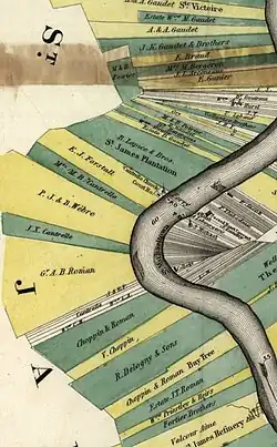 Lapice's first plantation was opposite Vicksburg, Mississippi.[8] He reportedly first entered the business of growing and processing sugarcane slightly before 1833.[9] He sometimes served as "security" in legal matters for slave trader and cotton planter Rice C. Ballard.[4] One of his plantations was in the path of the Great Natchez Tornado of 1840, and several enslaved people bound there were killed: "M. Lapice. Esq. suffered immensely in his Arno plantation, below Vidalia. His negro quarters were all blown down, four or five negroes killed outright, about twenty dangerously, some of them mortally wounded, and thirty or forty more seriously injured. His plantation has resounded with groans since the storm. He estimates his loss at thirty thousand dollars".[10] In 1850 there was a lethal typhoid outbreak at his Whitehall plantation.[11]