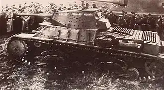 Only 21 P 40s were finished in September 1943 and during the armistice it served in the defence of Rome. The Germans ordered production to continue after the armistice and appropriated completed tanks to the Southern Tank Training Battalion, 10th and 15th Police Panzer Companies, and the 24th Waffen Mountain Division of the SS Karstjäger.[4] The Southern Tank Training Battalion trained units to use captured Italian tanks and had five P 40s in their inventory. The 10th Police Panzer Company served in Russia before redeployment to northern Italy in late 1944 for anti-partisan duties with the 15th Police Panzer Company.[8] Formed in summer of 1944, the 24th Waffen Mountain Division was deployed to Trieste and Udine along the Adriatic coast. While retreating towards Austria in March 1945, they lost several P 40 tanks to Shermans of the British 6th Armoured Division. About a hundred P 40s were used by the German military, of which about 40 were without engines and used as static emplacements at defensive positions such as the Gustav and Gothic Lines.[8]