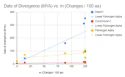 PANO1 was compared to two other genes, fibrinogen alpha chain as well as cytochrome C. The date of divergence as well as amino acid changes were tracked over many different species types to generate a divergence date vs. number of amino acids changes as seen to the right. PANO1 appears to diverge much more quickly than fibrinogen alpha and much more quickly than cytochrome c.