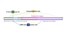 A possible cleavage site was identified between amino acids 33 and 34 as depicted in the PANO1 protein model.[3] As mentioned previously, 6 N-myristoylation sites, 2 cAMP phosphorylation sites, and 4 protein kinase C phosphorylation sites are also present.[3]