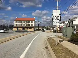 PA 62 was renumbered to PA 100 on June 1, 1932, in order to avoid conflicting with US 62, which was designated in the northwestern part of the state.[13][14] The road was paved between Fogelsville and Pleasant Corners during the 1930s.[15] At the Delaware border, PA 100 connected to DE 100, which was designated in 1938.[16] By 1953, PA 100 was realigned to its current straight alignment between south of Bechtelsville and Bally, bypassing Bechtelsville and Barto to the east. The former alignment is now known as Main Street and Old Route 100.[17]