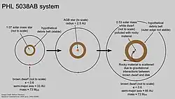 The PHL 5038 system during the main-sequence had a star with a mass similar or more massive than the sun and it had a brown dwarf at an orbit of 33 AU, similar to the orbital distance of Neptune. It also likely had rocky debris in the form of planetesimals in orbit around the star, maybe similar to the asteroid belt. At the end of its lifetime the star became an AGB star with a size smaller than 2.5 AU, leaving the rocky debris mostly intact. As the star lost around half of its mass, the orbit of the brown dwarf and the planetesimals increased. The debris would be stable within 17-32 AU (circular orbit of the brown dwarf) or 5-8 AU (e=0.6 for the brown dwarf orbit). A debris belt with an increased size might be close to the edge of this stable zone and gravitational interactions with the brown dwarf would scatter planetesimals into all kinds of directions, eroding the edge of the debris belt. Some of these planetesimals will be scattered inwards and are being disrupted by the tidal forces of the white dwarf, leading to the pollution of the white dwarf atmosphere. Alternatively the disk could have been larger than the stable zone, resulting in chaotic scattering at the beginning of the white dwarf stage, until the scattering decreased.[2]