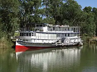 PV Coonawarra is a diesel-powered paddle vessel that operated as a tourist vessel on the Murray River. Built in Echuca in 1950 from the barge J L Roberts (itself built in 1894), the Coonawarra was intended by owners Murray Valley Coaches Ltd to replace the tourist vessel PS Murrumbidgee, which burnt beyond repair in 1948.[6] The Coonawarra is currently moored in Midlura, overlooking the weir and wharf, operating as a floating motel.[7]