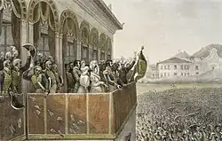 Princess Isabel is cheered from the central balcony by a crowd in the streets, moments after having signed the Golden Law, 1888 -