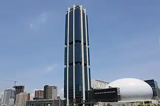 The skyscraper's concept aimed the creation of an iconic landmark for Monterrey, as it is the first building to exceed 200 meters in height in the central area of the city. In January 2015, the tower was the tallest building in the metropolitan area as well as in the state of Nuevo León, surpassing Torre Ciudadana after being topped out. In October 2015, the Business Center and the skyscraper were inaugurated, and in June 2016, the construction of the Auditorium was also completed. The building is located on one of the main avenues of the city, Avenida Constitución.[7] The skyscraper was designed by Mexican architect Agustín Landa Vértiz with the main aim being to help with the regeneration of the city centre, as in recent years the area lacked investment and urban furniture development. The notable features of the complex are the skyscraper itself due to its height and the Auditorium due to its ellipse shape which has a capacity of up to 4,500 people.[8] The purpose of the project was the development of a complex to house offices or businesses with a Hotel and Convention Centre to attract investment back to the area.[9]