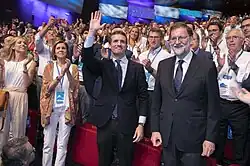 After the motion of no confidence, Mariano Rajoy resigned from the leadership of the PP, Pablo Casado ran as pre-candidate to the primary election to the presidency of the party. He introduced himself as a (potential) leader intending to recover voters from Citizens and Vox.[42] Casado obtained the second most votes out of 6 candidates after Soraya Sáenz de Santamaría, former Deputy Prime Minister of Spain, who received the most votes among the party members with a margin of 1,500 votes. On July 21, 2018, during the 19th Extraordinary National Congress of the PP, a final vote among 3,082 party delegates was held in order to decide the new leader of the PP between Sáenz de Santamaría and Casado.[43][44] He won the voting among the delegates with 1,701 votes (57,2%) versus 1,250 (42%) votes to Sáenz de Santamaría out of 2,973 votes, being proclaimed as the new president, in what was considered a party swing towards the right,[45][46][47] as well as a hardline conservative.[48]