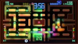 Gameplay revolves around three main modes: Score Attack, in which players attempt to get the highest score within five or ten minutes; Time Attack, consisting of several short trials and one long one in which players must obtain a certain amount of fruit as quickly as possible; and Ghost Combo, where players must try to stay powered up and eat as many ghosts as possible. The game features nine courses, which include the original maze from Championship Edition, in which the sleeping ghosts are absent. Players receive a ranking for each game mode per course, which is based on their position on the overall leaderboards. The game has various visual styles, including some in the style of Pac-Mania, which can be mixed and matched.[2] Players may also access a constantly updated NG News feature, which includes articles such as developer interviews, as well as view video replays of the highest-ranking Score Attack players via the leaderboard.
