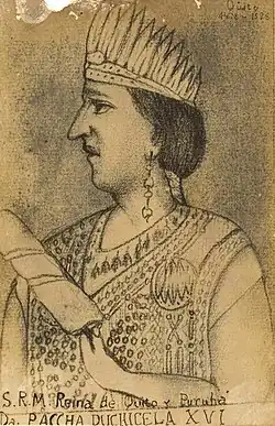 Paccha Duchicela (1485–1525), was, according to the priest Juan de Velasco, a queen regnant of Quito in 1487–1525 and co-reigned with her husband Huayna Capac, the Emperor of Inca Empire.[1] As all the kings and queens of Quito, she is only mentioned by de Velasco. She was also a consort of the Inca Empire by marriage to the Sapa Inca Huayna Capac (r 1493–1527). She has been pointed out as the mother of Atahualpa.