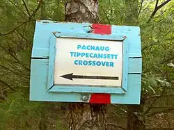 The trail connects to other Blue-Blazed trails in Connecticut's Pachaug State Forest: the Quinebaug Trail in the Philips Pond through Flat Rock section, and the Nehantic Trail at Green Falls Pond. The Nehantic and Pachaug trails overlap for a section which includes Mount Misery and the Chapman Management Area (which includes the Rhododendron Sanctuary Trail). Lee and Breakneck Roads connecting these two trails and is marked with blue and red blazes (a blue blaze with a red bar in the lower half of the blaze). There are three connector trails from the Quinebaug to the Pachaug trail: The Quinebaug-Pachaug Crossover trail from the Quinebaug at Philips Pond to the Pachaug marked with blue and red blazes, the section of Hell Hollow Road between the two trails marked with marked with blue and red blazes, and the Pachaug-Quinebaug Crossover trail marked with yellow blazes.[1]