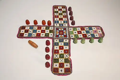 Pachisi (/pəˈtʃiːzi/ pə-CHEE-zee, Hindustani: [pəˈtʃiːsiː]) is a cross and circle board game that originated in Ancient India. It is described in the ancient text Mahabharata under the name of "Pasha".[1] It is played on a board shaped like a symmetrical cross. A player's pieces move around the board based upon a throw of six or seven cowrie shells as lots, with the number of shells resting with the aperture upward indicating the number of spaces to move.