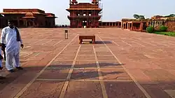 The game of Pachisi was played by Akbar in a truly regal manner. The Court itself, divided into red and white squares, being the board, and an enormous stone raised on four feet, representing the central point. It was here that Akbar and his courtiers played this game; sixteen young slaves from the harem wearing the players' colours, represented the pieces, and moved to the squares according to the throw of the dice. It is said that the Emperor took such a fancy to playing the game on this grand scale that he had a court for pachisi constructed in all his palaces, and traces of such are still visible at Agra and Allahabad.[10]