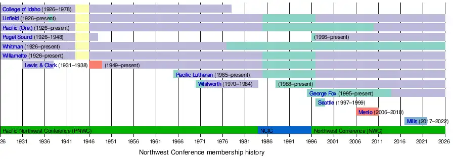 - ^ Puget Sound left the NWC after the 1947β48 school year before re-joining back in the 1996β97 school year.