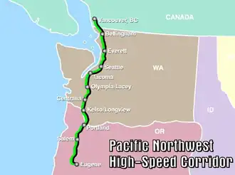 The Pacific Northwest Corridor or the Pacific Northwest Rail Corridor is one of eleven federally designated higher-speed rail corridors in the United States and Canada.[1] The 466-mile (750 km) corridor extends from Eugene, Oregon, to Vancouver, British Columbia, via Portland, Oregon and Seattle, Washington, in the Pacific Northwest region. It was designated a high-speed rail corridor on October 20, 1992, as the one of five high-speed corridors in the Intermodal Surface Transportation Efficiency Act of 1991 (ISTEA).[2]