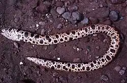The Pacific snake eel (Ophichthus triserialis, also known as the spotted snake eel in the United States[2]) is an eel in the family Ophichthidae (worm/snake eels).[3] It was described by Johann Jakob Kaup in 1856, originally under the genus Muraenopsis.[4] It is a marine, subtropical eel which is known from the eastern central and southeastern Pacific Ocean, including California, USA, Peru, the Gulf of California, Mexico, the Galapagos Islands, Colombia, Ecuador, Costa Rica, El Salvador, Honduras, Guatemala, Nicaragua, and Panama.[3][5] It dwells at a maximum depth of 155 metres (509 ft), and forms burrows in mud and sand sediments. Males can reach a maximum total length of 115 centimetres (45 in), but more commonly reach a TL of 80 centimetres (31 in).[3]