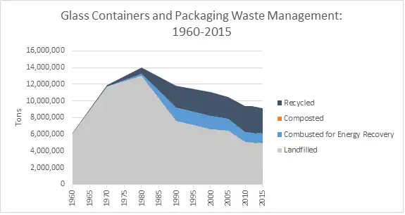 Bottles and jars for drinks and storing foods or juices are examples of glass containers. It has been estimated by the EPA that 9.1 million tons of glass containers were generated in 2015, or 3.5 percent of municipal solid waste (MSW).[5] About 70 percent of glass consumption is used for containers and packaging purposes.[14] At least 13.2 percent of the production of glass and containers are burned with energy recovery.[5] The amount of glass containers and packaging going into the land fill is about 53 percent.[5]