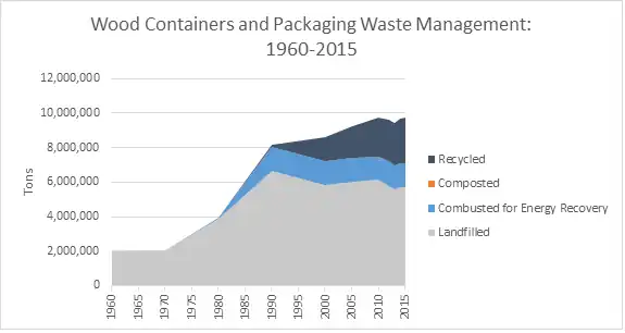 Wood packaging is anything that is made out of wood used for packaging purposes (e.g., wood crates, wood chips, boards, and planks). Wood packaging is still highly used in today's world for transporting goods. According to EPA's data that were borrowed from the Virginia Polytechnic Institute and the United States Department of Agriculture's Forest Service Southern Research Station, 9.8 million tons (3.7 percent of total MSW) of wood packaging were made in production in 2015.[5] Also, in 2015, the amount that was recycled 2.7 million tons.[5] Moreover, its estimated that 14.3 percent of the wood containers and packaging waste generated was combusted with energy recovery, while the 58.6 percent went to the land filled.