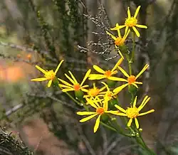 The inflorescence bears several flower heads containing many yellow disc florets and several narrow yellow ray florets each up to 1.6 centimeters long.