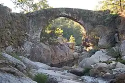 A packhorse bridge is a bridge intended to carry packhorses (horses loaded with sidebags or panniers) across a river or stream. Typically a packhorse bridge consists of one or more narrow (one horse wide) masonry arches, and has low parapets so as not to interfere with the panniers borne by the horses.[1] Multi-arched examples sometimes have triangular cutwaters that are extended upward to form pedestrian refuges.[2]: 24–25