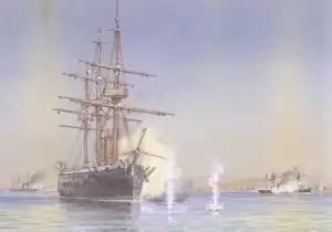 The Battle of Pacocha was a naval battle that took place on 29 May 1877 between the rebel-held Peruvian monitor Huáscar and the British ships HMS Shah and HMS Amethyst. The vessels did not inflict significant damage on each other, however the battle is notable for seeing the first combat use of the self-propelled torpedo.