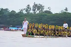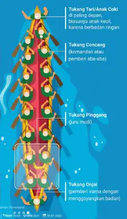 Before the main event of "Pacu Jalur 'is started, it usually held entertainment performances like singing and dancing performances to entertain all participants and surrounding communities. Nowadays, prior to the festival, smaller paddling events were held in four districts, followed by a traditional mini route held at Tepian Narosa Teluk Kuantan.[21] The racetrack follows the flow of Batang Kuantan River, with a track length of about 1 km marked by six piles. The wooden boat taking part in the competition usually have a length of 25 to 40 meters and the width of the middle section of approximately 1.3 ms / d 1.5 m. The crew for each boat varies from 50 to 60 people. Each of the crew has his own task, there is the commander who shouts out instructions, the helmsman, another one leads the boat by dancing from left to right, while another provides the "music" to provide rhythm and ensure regularity to paddlers. All these are in order that the boat moves fast forward in the right direction, provide balance, and paddlers follow the same rhythm.