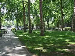 St Mary on Paddington Green Church is part of the Parish of Little Venice and is the third church on this site. The church was built in 1791 by John Plaw.[4] Its graveyard – known as St Mary's Gardens (or St Mary's Churchyard) – contains monuments to notable local residents, including actress Sarah Siddons (also buried there), sculptor Joseph Nollekens and lexicographer Peter Mark Roget.[5] The southern part of the graveyard was removed to make way for the flyover. Exhumed remains were re-interred in Mill Hill Cemetery.[6]