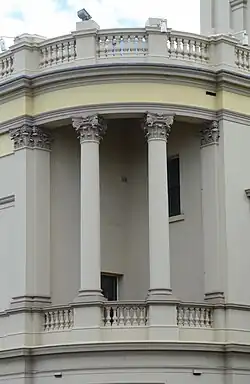 The clock tower is located on the corner of Oxford Street and Oatley Road. As with the facades, the main decorative form is Corinthian pilasters, pairs of which support the clock. Doric columns and a pediment frame the clock. The tower is finished with a dome supported by an octagonal drum.[2]