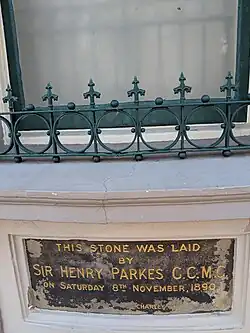Situated at the highest point on the Oxford Street ridge, the town hall's foundation stone was laid on 8 November 1890 by Sir Henry Parkes and was opened with great fanfare on 3 October 1891 by the Governor, The Earl of Jersey.[2][4][5] The first major alteration to the Town Hall occurred in 1904–1905, when the clock tower was erected in commemoration of the coronation of King Edward VII. The face of the clock is inscribed with "Edwardus VII". The honour to King Edward was that Paddington was, at the time, a large town hall, second only to Sydney.[2]
