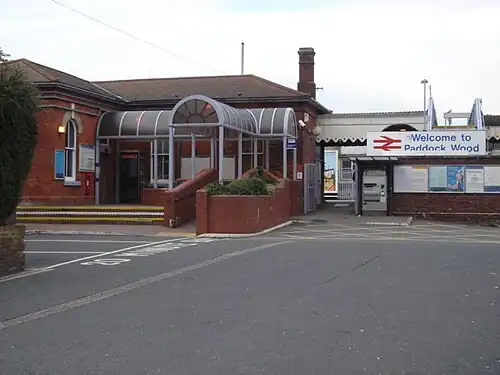 Paddock Wood railway station is on the South Eastern Main Line and Medway Valley Line in south-east England, serving the Borough of Tunbridge Wells town of Paddock Wood. The station also serves the villages of Matfield, Brenchley and Horsmonden, which do not have stations of their own. It is 34 miles 67 chains (56.1 km) down the line from London Charing Cross. The station and all trains calling there are operated by Southeastern.