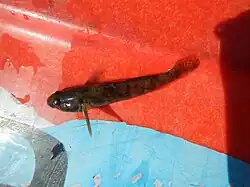 As with many other Gobiidae species, Padogobius males establish small territories around their nesting sites in freshwater streams and rivers of Northern Italy.[2][3] In P. martensi, both male and female are highly aggressive in defending a hollow beneath a stone.[4] During the breeding season between May and July, these males become exceptionally competitive as they try to acquire larger stones which will have a larger egg-laying surface.[5] Due to the fact that this will influence their breeding success, there is competition between males for this resource that is in limited supply and in high demand.[5] Only larger and more aggressive males will be capable of securing such a valuable resource, which aids in establishing dominance.[5] This intersexual male competition for resources causes male body size to be positively correlated with the quality of the resources in which they defend.[4] This means that larger males are sexually selected for larger body size, as it allows them to be superior at obtaining larger nesting sites and access to females.[6] Their body size also relates to how far apart territories will be from one another, establishing territory size and distribution.[5] Overall it can be said that P. martensi males which are larger and display higher aggression will have a higher Resource Holding Potential[5], or in other words are most likely to win a competition.