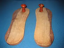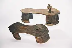 Paduka (Sanskrit: पादुक, romanized: pāduka) is an ancient form of footwear in India, consisting of a sole with a post and knob which is positioned between the big and second toe.[2] It has been historically worn in South Asia and Southeast Asia. Paduka exist in a variety of forms and materials. They might be made in the shape of actual feet, or of fish, for example, and have been made of wood, ivory and silver. They may be elaborately decorated, such as when used as part of a bride's trousseau, but could also be given as religious offerings or themselves be the object of veneration.[1]