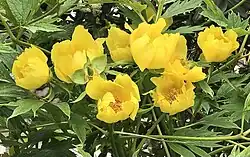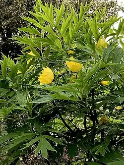 Paeonia ludlowii is a deciduous shrub of medium height, belonging to the tree peony section Moutan of the genus Paeonia, and endemic to southeast Tibet. In Tibet it is known as ≠'lumaidao' meaning "God's flower". The vernacular name in Chinese is 大花黄牡丹 (da hua huang mu dan) meaning "big yellow-flowered peony". In English it is sometimes called Tibetan tree peony or Ludlow's tree peony.[2] It has pure yellow, slightly nodding, bowl-shaped flowers, and large, twice compounded, light green leaves.[3][4][5]