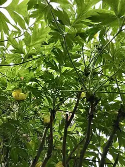 The species is used as a traditional medicine, and local people dig it up for its root bark.[11] Exploitation by people from other parts of China is a serious threat to the survival of this species.[5] The large seeds are ground into a flour used to prepare a type of tsampa and also to prepare seed oils and hair dye by the Lhoba people.[12] The shrub is sometimes cultivated as an ornamental for the sake of its handsome, yellow flowers and ferny foliage in botanical gardens and by plant collectors.